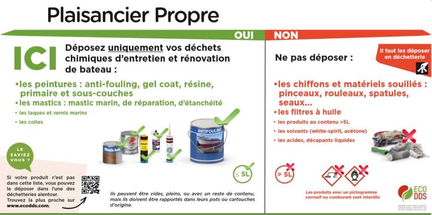 Dispositif de collecte de déchets chimiques d’entretien et rénovation de bateau de plaisanciers. La collecte est prise en charge par EcoDDS. |