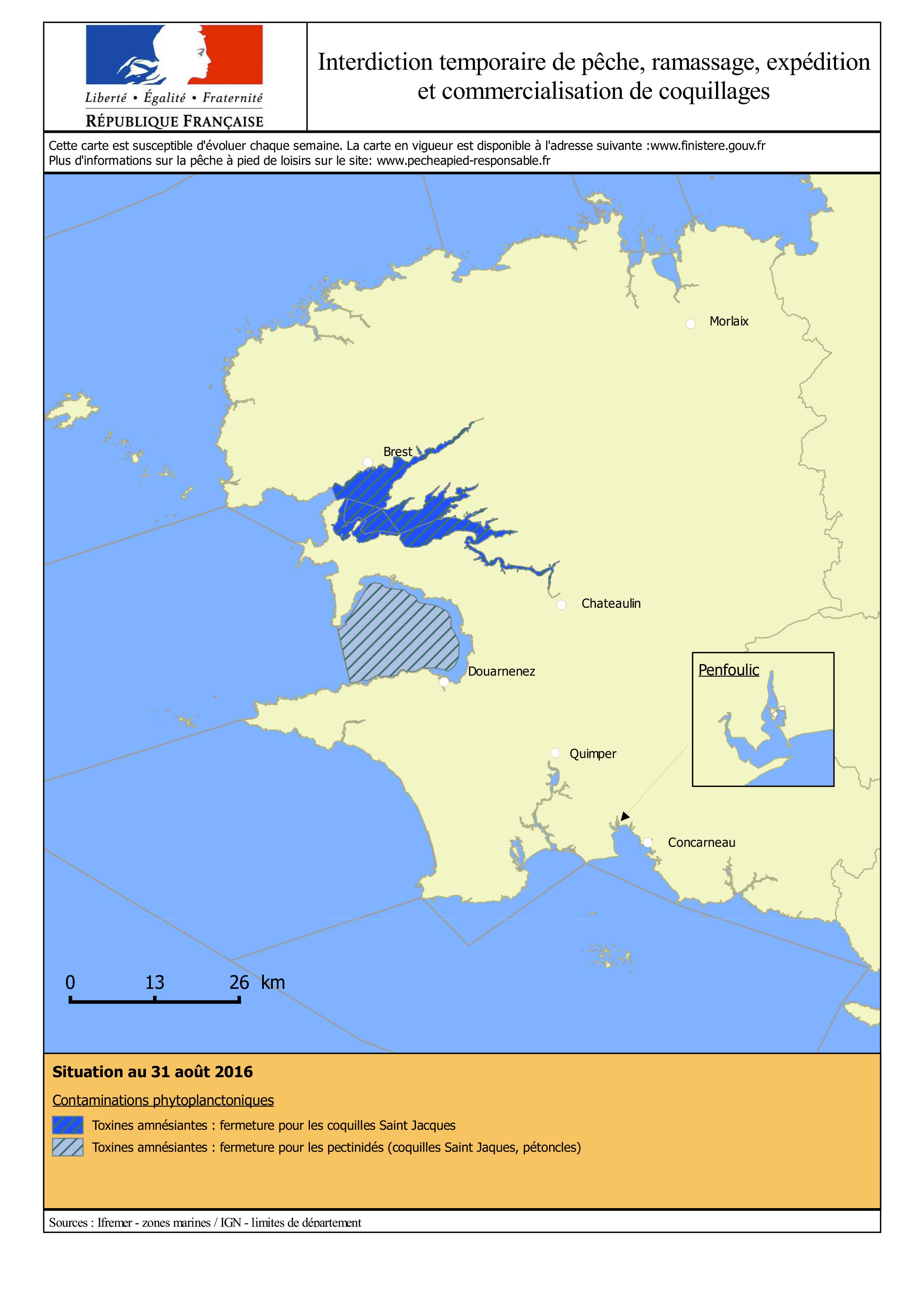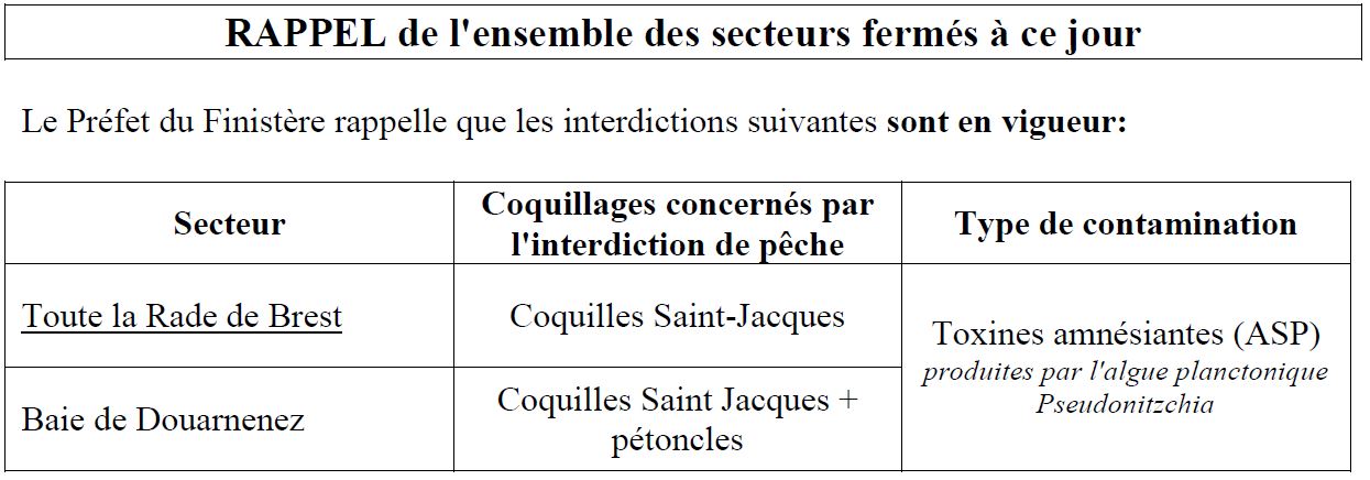 Compte tenu des résultats favorables de l’IFREMER sur la teneur en toxines des tellines des zones « Iroise Camaret – Dinan Kerloch » et « Baie de Douarnenez –Estran » et des moules de la zone « Baie de Concarneau », le Préfet du Finistère a décidé de lever l’interdiction de pêche de tous les coquillages dans ces 3 zones.