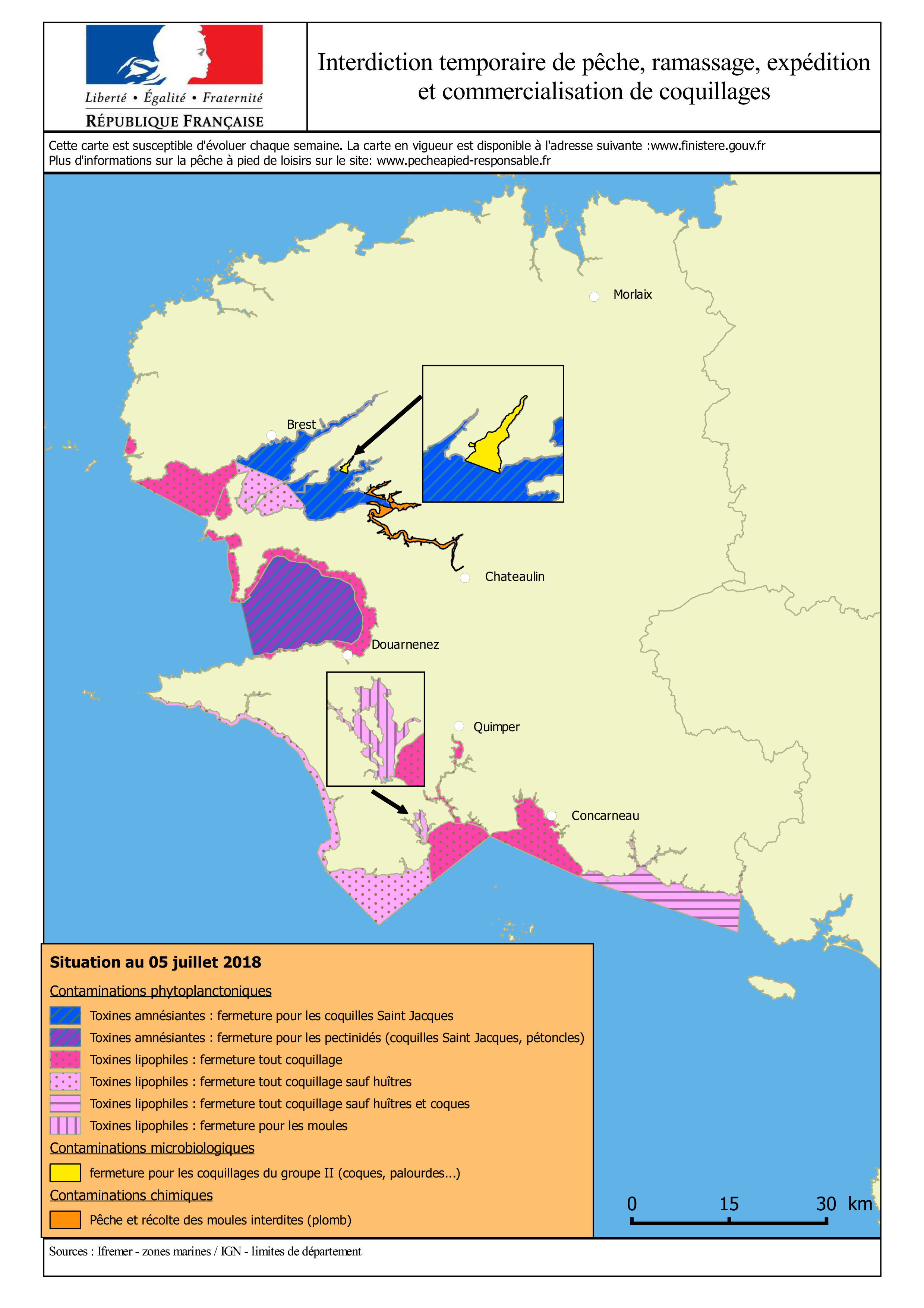 La carte actualisée des interdictions sanitaires de pêche de coquillages se trouve sur le site